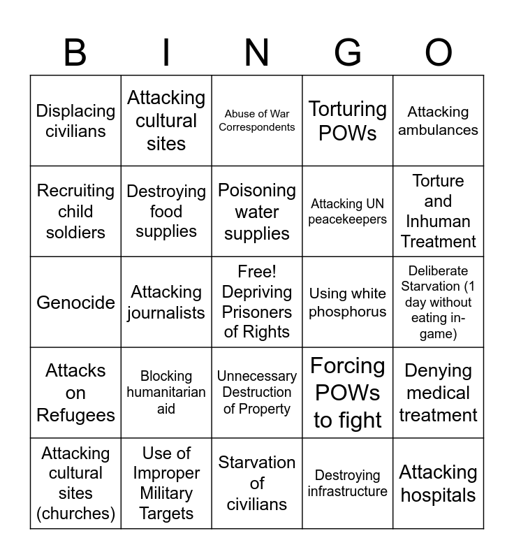 This bingo card has a free space and 49 words: Targeting civilians, Attacking hospitals, Human Shields, Starvation of civilians, Blocking humanitarian aid, Forced displacement, Attacking cultural sites, Collective punishment, Recruiting child soldiers, Arbitrary detention, Destroying food supplies, Torturing POWs, Denying medical treatment, Forcing POWs to fight, Using chemical weapons, Indiscriminate bombing, Poisoning water supplies, Using white phosphorus, Faking surrender, Attacking ambulances, Attacking journalists, Destroying infrastructure, Displacing civilians, Attacking UN peacekeepers, Indiscriminate Attack, Torture and Inhuman Treatment, Attacking cultural sites (churches), Attacks on Medical Personnel, Unnecessary Destruction of Property, Attacks on Refugees, Spreading False Information (to Provoke Attacks), Exploitation of Prisoners, Summary Executions, Deception, Use of Improper Military Targets, Biological Warfare (yellow and green m18), Excessive Use of Force, Targeting Cultural Sites, Deliberate Starvation (1 day without eating in-game), Mutilation of Bodies, Disproportionate Attacks, Fake Surrenders, Weapons That Cause Unnecessary Suffering (makes people cry), Psychological Warfare, Genocide, Abuse of War Correspondents, Disrespect for the Dead, Deceptive War Tactics and Failure to Provide Medical Aid.