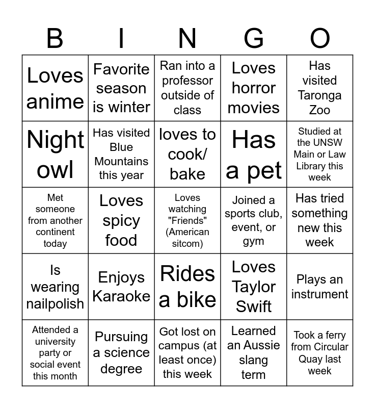 This bingo card has 64 words: Speak 3+ language, Loves reading, Just landed in Australia last week, Plays an instrument, Loves to play board games, Has run a Marathon, Favorite season is winter, Plays a social sports, loves to cook/ bake, Likes Domino's, Rides a bike, Is left handed, Has tried something new this week, Has visited Taronga Zoo, Prefers tea over coffee, Night owl, Loves spicy food, Loves anime, Has a March birthday, Has a pet, Enjoys Karaoke, Is wearing nailpolish, Loves horror movies, Grew up in a big family, Has been to other Australian cities, Plays video games, Enjoys hiking or camping, Is a good dancer, Enjoy swimming or surfing, Has volunteered, Grab 3+ freebies at O‑Week, Joined 3+ student clubs/societies at UNSW, Taking a math course this semester, Visited Bondi or another iconic Sydney beach last week, Studied at the UNSW Main or Law Library this week, Attended a university party or social event this month, Takes public transport daily, Learned an Aussie slang term, Lives on or near campus, Has visited Blue Mountains this year, Met someone from another continent today, Joined a sports club, event, or gym, Tried Kangaroo meat, Took a selfie at the Sydney Opera House, Wearing sunscreen today, Loves watching "Friends" (American sitcom), Pursuing a science degree, Took a ferry from Circular Quay last week, Loves Taylor Swift, Watched 3+ movies this year, Had a 9am lecture or tutorial this semester, Tried new cuisines at campus food court, Got lost on campus (at least once) this week, Met an ibis bird on campus today, Grabbed free food from Food Hub, Grabbed free stationary from Stationary Reuse Center, Ran into a professor outside of class, Visited UNSW Paddington campus, Went to the wrong classroom for a lecture or tutorial, Took a nap somewhere on campus this week, Took a guided campus tour at O-week, Had one or more group assignments this semester, Loves Tim Tams and Had a study buddy for an assignment or course.