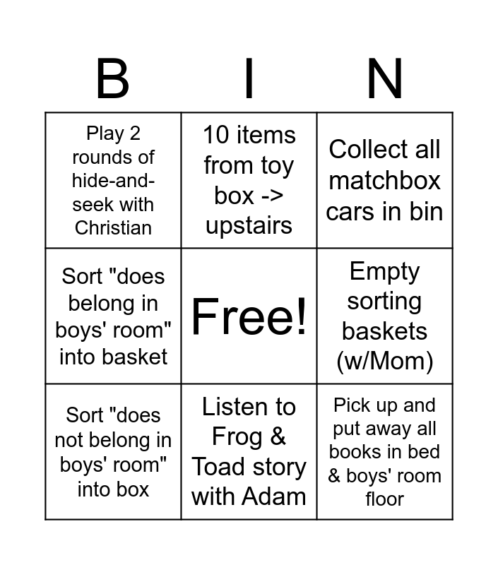 This bingo card has a free space and 8 words: Empty sorting baskets (w/Mom), Collect all matchbox cars in bin, 10 items from toy box -> upstairs, Sort "does not belong in boys' room" into box, Play 2 rounds of hide-and-seek with Christian, Pick up and put away all books in bed & boys' room floor, Sort "does belong in boys' room" into basket and Listen to Frog & Toad story with Adam.