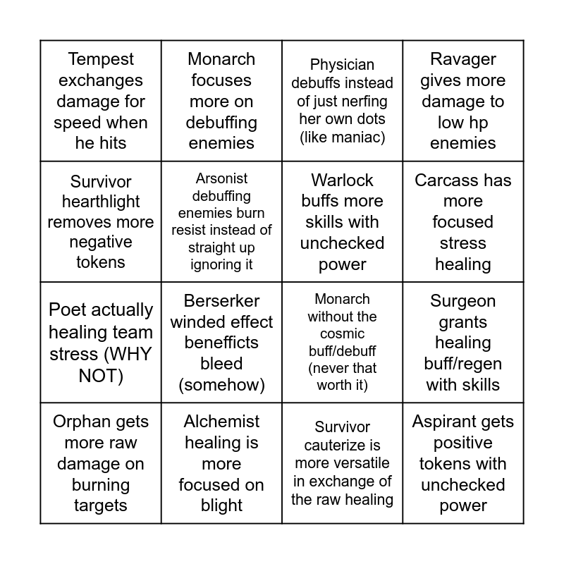 This bingo card has 16 words: Alchemist healing is more focused on blight, Surgeon grants healing buff/regen with skills, Physician debuffs instead of just nerfing her own dots (like maniac), Tempest exchanges damage for speed when he hits, Poet actually healing team stress (WHY NOT), Monarch focuses more on debuffing enemies, Monarch without the cosmic buff/debuff (never that worth it), Survivor cauterize is more versatile in exchange of the raw healing, Survivor hearthlight removes more negative tokens, Arsonist debuffing enemies burn resist instead of straight up ignoring it, Orphan gets more raw damage on burning targets, Ravager gives more damage to low hp enemies, Berserker winded effect benefficts bleed (somehow), Carcass has more focused stress healing, Warlock buffs more skills with unchecked power and Aspirant gets positive tokens with unchecked power.