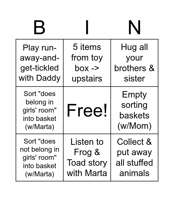 This bingo card has a free space and 8 words: Empty sorting baskets (w/Mom), Hug all your brothers & sister, 5 items from toy box -> upstairs, Sort "does not belong in girls' room" into basket (w/Marta), Play run-away-and-get-tickled with Daddy, Collect & put away all stuffed animals, Sort "does belong in girls' room" into basket (w/Marta) and Listen to Frog & Toad story with Marta.