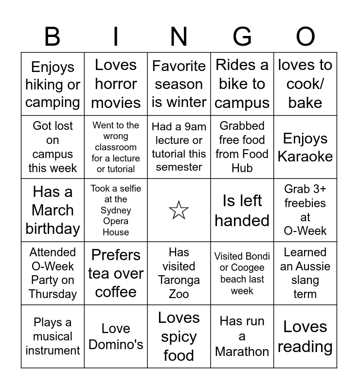 This bingo card has a free space and 43 words: Speak 3+ language, Loves reading, Just landed in Australia last week, Plays a musical instrument, Loves to play board games, Has run a Marathon, Favorite season is winter, Plays a social sports, loves to cook/ bake, Love Domino's, Rides a bike to campus, Is left handed, Has visited Taronga Zoo, Prefers tea over coffee, Is a Night owl, Loves spicy food, Loves anime, Has a March birthday, Has more than 2 pets, Enjoys Karaoke, Loves horror movies, Has been to other Australian cities, Plays video games as a hobby, Enjoys hiking or camping, Is a good dancer, Grab 3+ freebies at O‑Week, Joined 3+ student clubs/societies at UNSW, Taking a math course this semester, Visited Bondi or Coogee beach last week, Attended O-Week Party on Thursday, Takes public transport daily, Learned an Aussie slang term, Lives on or near campus, Took a selfie at the Sydney Opera House, Is Pursuing a science degree, Took a ferry from Circular Quay last week, Loves Taylor Swift, Had a 9am lecture or tutorial this semester, Got lost on campus this week, Grabbed free food from Food Hub, Grabbed free stationary from Stationary Reuse Center, Went to the wrong classroom for a lecture or tutorial and Took a guided campus tour at O-week.