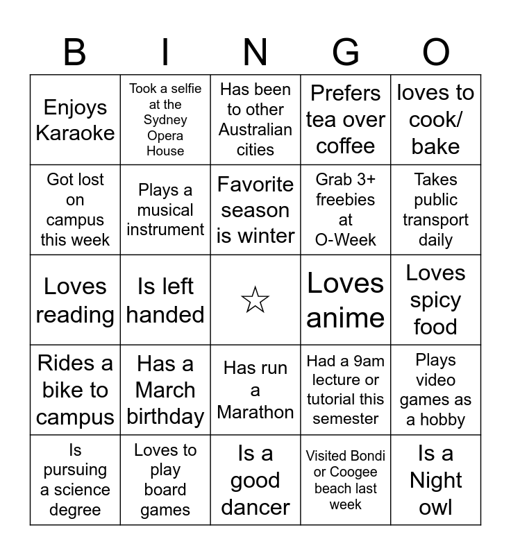 This bingo card has a free space and 41 words: Speak 3+ language, Loves reading, Just landed in Australia last week, Plays a musical instrument, Loves to play board games, Has run a Marathon, Favorite season is winter, Plays a social sports, loves to cook/ bake, Rides a bike to campus, Is left handed, Prefers tea over coffee, Is a Night owl, Loves spicy food, Loves anime, Has a March birthday, Has more than 2 pets, Enjoys Karaoke, Loves horror movies, Has been to other Australian cities, Plays video games as a hobby, Enjoys hiking or camping, Is a good dancer, Grab 3+ freebies at O‑Week, Joined 3+ student clubs/societies at UNSW, Taking a math course this semester, Visited Bondi or Coogee beach last week, Attended O-Week Party on Thursday, Takes public transport daily, Learned an Aussie slang term, Lives on or near campus, Took a selfie at the Sydney Opera House, Is pursuing a science degree, Took a ferry from Circular Quay last week, Had a 9am lecture or tutorial this semester, Got lost on campus this week, Met an Ibis bird on campus, Grabbed free food from Food Hub, Grabbed free stationary from Stationary Reuse Center, Went to the wrong classroom for a lecture or tutorial and Took a guided campus tour at O-week.