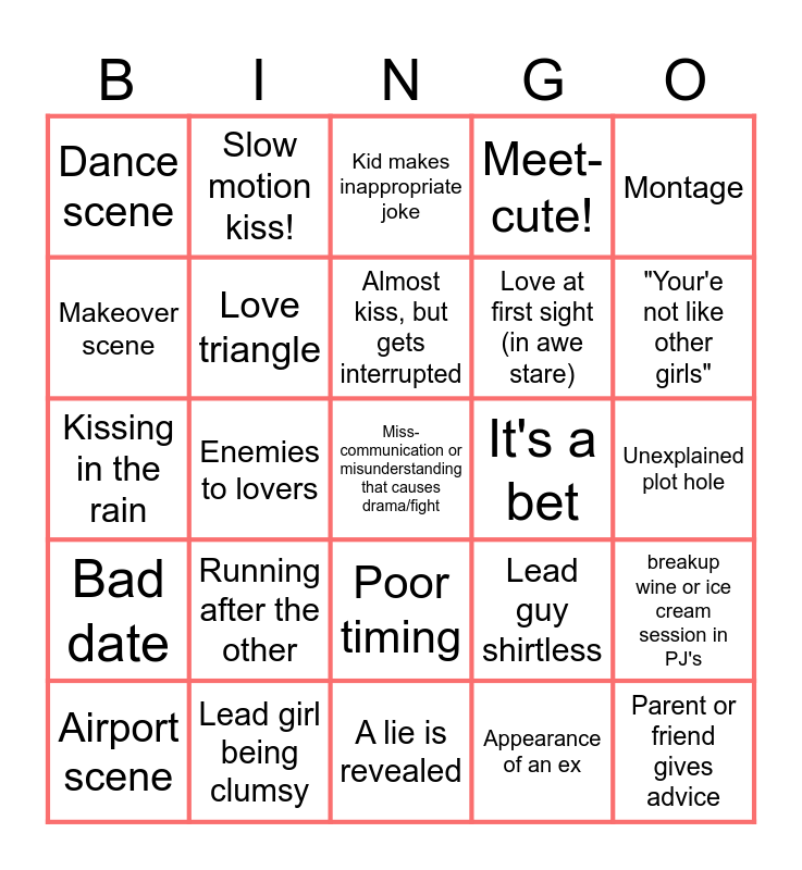 This bingo card has 1 images and 35 words: Trouble saying I Love You, Tragic backstory, quirky or gay BFF, Love triangle, Poor timing, Meet-cute!, Makeover scene, Physical Comedy, Almost kiss, but gets interrupted, calling off a wedding/engagement, Kissing in the rain, Montage, Jo gets emotional, Singing in public to profess love, Dance scene, It's a bet, Appearance of an ex, Enemies to lovers, Bad date, Miss-communication or misunderstanding that causes drama/fight, Lead guy shirtless, Airport scene, breakup wine or ice cream session in PJ's, Lead girl being clumsy, Kid makes inappropriate joke, "Your'e not like other girls", Parent or friend gives advice, One of the leads is rich, Love at first sight (in awe stare), Unexplained plot hole, Accidentally fall on each other, A lie is revealed, Running after the other, Slow motion kiss! and Secondary characters get together.