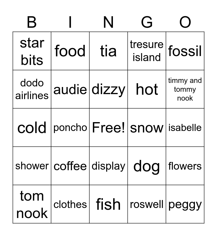 This bingo card has a free space and 24 words: coffee, clothes, dizzy, tom nook, fossil, star bits, dodo airlines, food, snow, display, hot, cold, dog, flowers, audie, roswell, isabelle, tia, timmy and tommy nook, poncho, peggy, shower, tresure island and fish.
