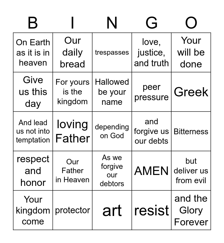 This bingo card has 25 words: Our Father in Heaven, art, Hallowed be your name, Your kingdom come, Your will be done, On Earth as it is in heaven, Give us this day, Our daily bread, and forgive us our debts, As we forgive our debtors, peer pressure, And lead us not into temptation, AMEN, but deliver us from evil, For yours is the kingdom, and the Glory Forever, Bitterness, trespasses, Greek, loving Father, depending on God, protector, respect and honor, love, justice, and truth and resist.