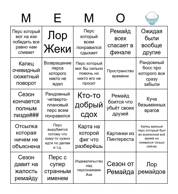 This bingo card has 30 words: Перс с супер странным именем, Должен был быть жоский боссфайт но мы его избежали, Рандомный четверто-плановый перс всем понравился, Рони сделает какую-то хрень из-за которой приходится всё переписывать, Перс который мог на изи победить все равно нам сливает, Перс который всем понравился сдыхает, Возвращение перса которого никто не ждал, Карта на которой фиг что разберёшь, Ремайд боится что убьёт своих друзей, Издевательство над персонажами Аза, Куча безымянных врагов, Кто-то добрый сдох, Сезон от Ремайда, Лор ремайдов, Рандомный босс про которого все сразу забыли, Характеристики, цифры и всё такое, Картинки из Пинтереста, Отсылка которая ничем не объяснена, Перс вырубается потому что кому-то нужно идти по делам и т.д., Ожидая были вообще другие, Сезон кончается полным пизде###, Существа из мифов (Драконы, Левиафаны, Демоны и т.д.), Лор Жеки, Пространство времени, Капец очевидный сюжетный поворот, Ремайд всех спасает в финале, Капец важный перс который был во вселенной всё время но появился только сейчас, Сезон давит на жалость ремайду, Перс который мог бы сильно помочь но никто его не просит and Злой перс стал нам помогать.