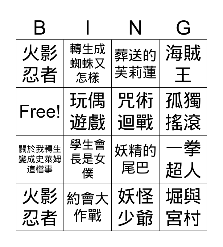 This bingo card has 16 words: 約會大作戰, 一拳超人, 葬送的芙莉蓮, 火影忍者, 關於我轉生變成史萊姆這檔事, 轉生成蜘蛛又怎樣, 妖精的尾巴, 妖怪少爺, Free!, 玩偶遊戲, 火影忍者, 海賊王, 學生會長是女僕, 孤獨搖滾, 咒術迴戰 and 堀與宮村.