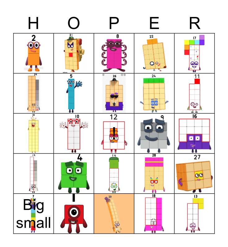 This bingo card has 29 images, a free space and 2 words: Big small and Short longgggggg.