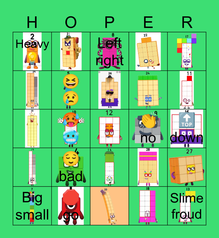 This bingo card has 29 images, a free space and 12 words: Big small, Short high, 🥵 🥶, Weak stongg, Heavy 💡, Left right, 😆 😢, 😌 bad, 👏 no, 🛑 go, 🔝 down and Slime froud.