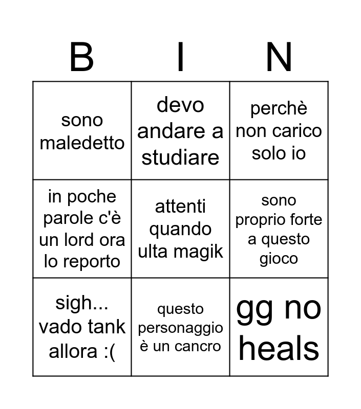 This bingo card has 9 words: sigh... vado tank allora :(, perchè non carico solo io, devo andare a studiare, in poche parole c'è un lord ora lo reporto, sono maledetto, sono proprio forte a questo gioco, attenti quando ulta magik, gg no heals and questo personaggio è un cancro.