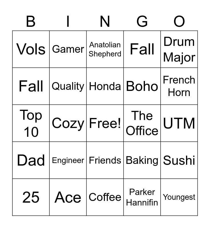 This bingo card has a free space and 24 words: Engineer, Ace, Honda, 25, Drum Major, Vols, Fall, Gamer, The Office, Friends, Boho, Top 10, Baking, Sushi, Quality, Parker Hannifin, UTM, Anatolian Shepherd, French Horn, Cozy, Youngest, Dad, Fall and Coffee.