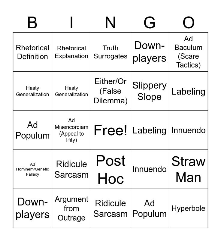 This bingo card has a free space and 40 words: Straw Man, Ad Populum, Slippery Slope, Hasty Generalization, Argument from Outrage, Post Hoc, Either/Or (False Dilemma), Red Herring, Ad Baculum (Scare Tactics), Ad Hominem/Genetic Fallacy, Ad Misericordiam (Appeal to Pity), Down-players, Hyperbole, Innuendo, Labeling, Ridicule Sarcasm, Rhetorical Analogy, Rhetorical Definition, Rhetorical Explanation, Truth Surrogates, Straw Man, Ad Populum, Slippery Slope, Hasty Generalization, Argument from Outrage, Post Hoc, Either/Or (False Dilemma), Red Herring, Ad Baculum (Scare Tactics), Ad Hominem/Genetic Fallacy, Ad Misericordiam (Appeal to Pity), Down-players, Hyperbole, Innuendo, Labeling, Ridicule Sarcasm, Rhetorical Analogy, Rhetorical Definition, Rhetorical Explanation and Truth Surrogates.
