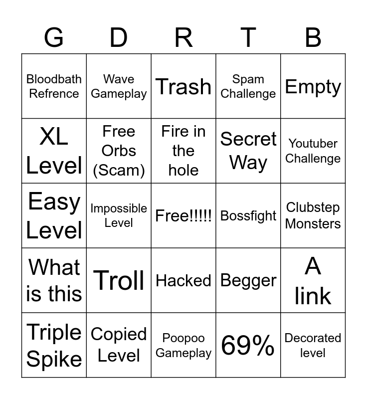 This bingo card has a free space and 24 words: Triple Spike, Troll, Fire in the hole, 69%, Empty, Bloodbath Refrence, Wave Gameplay, Trash, Bossfight, Clubstep Monsters, Easy Level, Free Orbs (Scam), Begger, A link, XL Level, Copied Level, Poopoo Gameplay, Spam Challenge, Youtuber Challenge, What is this, Impossible Level, Hacked, Secret Way and Decorated level.