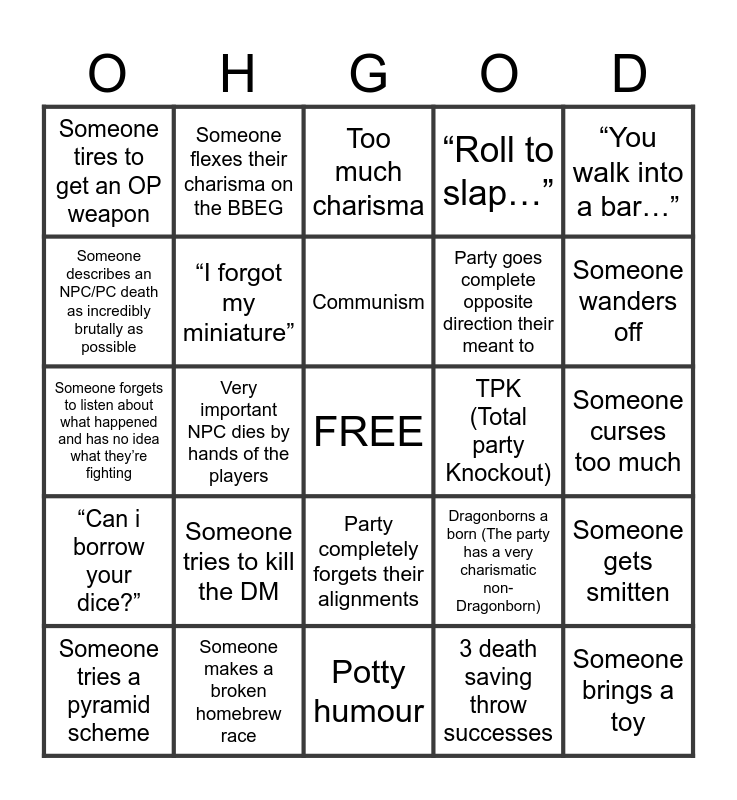 This bingo card has a free space and 24 words: Someone tries to kill the DM, Someone makes a broken homebrew race, Communism, Someone tries a pyramid scheme, “You walk into a bar…”, Someone tires to get an OP weapon, Someone describes an NPC/PC death as incredibly brutally as possible, Someone flexes their charisma on the BBEG, TPK (Total party Knockout), Party completely forgets their alignments, Party goes complete opposite direction their meant to, Someone forgets to listen about what happened and has no idea what they’re fighting, Dragonborns a born (The party has a very charismatic non-Dragonborn), Someone gets smitten, “I forgot my miniature”, 3 death saving throw successes, Someone curses too much, Too much charisma, Someone wanders off, Very important NPC dies by hands of the players, Someone brings a toy, “Can i borrow your dice?”, “Roll to slap…” and Potty humour.