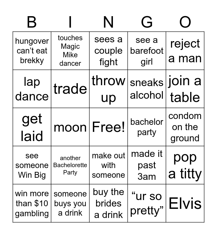 This bingo card has a free space and 24 words: another Bachelorette Party, someone buys you a drink, throw up, win more than $10 gambling, reject a man, hungover can’t eat brekky, lap dance, touches Magic Mike dancer, bachelor party, make out with someone, sneaks alcohol, get laid, made it past 3am, pop a titty, trade, “ur so pretty”, condom on the ground, sees a couple fight, join a table, moon, Elvis, see someone Win Big, see a barefoot girl and buy the brides a drink.