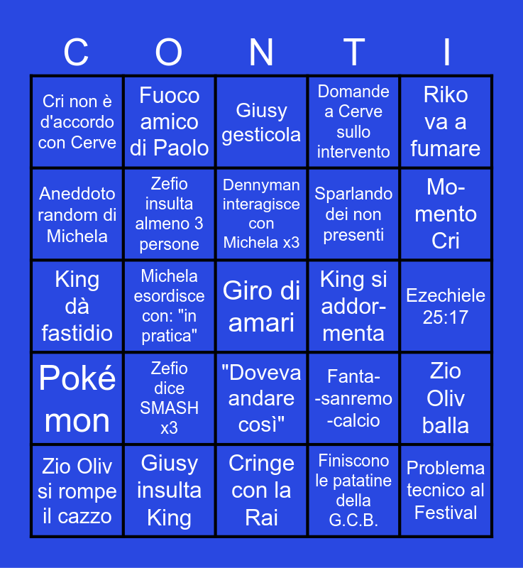 This bingo card has a free space and 24 words: Zefio dice SMASH x3, Giusy insulta King, Dennyman interagisce con Michela x3, Zio Oliv si rompe il cazzo, Riko va a fumare, Cri non è d'accordo con Cerve, Aneddoto random di Michela, Fuoco amico di Paolo, King si addor-menta, "Doveva andare così", Sparlando dei non presenti, King dà fastidio, Fanta- -sanremo -calcio, Zio Oliv balla, Zefio insulta almeno 3 persone, Finiscono le patatine della G.C.B., Ezechiele 25:17, Giusy gesticola, Mo-mento Cri, Michela esordisce con: "in pratica", Problema tecnico al Festival, Poké mon, Domande a Cerve sullo intervento and Cringe con la Rai.