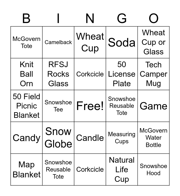 This bingo card has a free space and 24 words: Snow Globe, Snowshoe Reusable Tote, Corkcicle, Map Blanket, Wheat Cup or Glass, McGovern Tote, Knit Ball Orn, Camelback, Snowshoe Reusable Tote, Candle, 50 License Plate, 50 Field Picnic Blanket, Measuring Cups, McGovern Water Bottle, RFSJ Rocks Glass, Natural Life Cup, Game, Wheat Cup, Tech Camper Mug, Snowshoe Tee, Snowshoe Hood, Candy, Soda and Corkcicle.