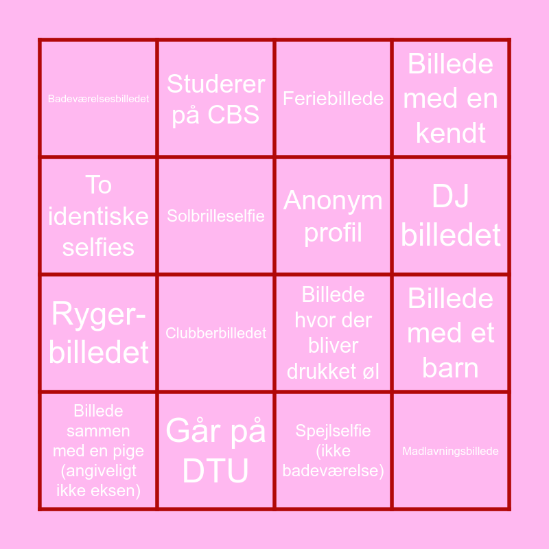 This bingo card has 31 words: Gruppebilledetæ.æ, Holder en fisk-billedet, Billede med et barn, Billede med en hund, Badeværelsesbilledet, Feriebillede, Anonym profil, Guitarbillede, Går på DTU, Bar kas’-billedet, Spejlselfie (ikke badeværelse), Billede sammen med en pige (angiveligt ikke eksen), Billede I suit, Cykelbilledet, Clubberbilledet, Billede hvor jeg bliver drukket vin, Billede i fitten, Militærbillede, Madlavningsbillede, Billede taget i en bil, To identiske selfies, “Søger nytårs fest”-profil, Sengeselfie, Studerer på CBS, Ryger-billedet, Solbrilleselfie, Billede med en kendt, Billede hvor der bliver drukket øl, Boomerang, DJ billedet and Skibilledet.