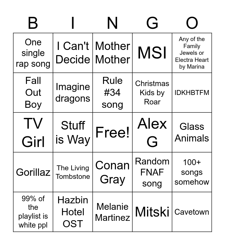 This bingo card has a free space and 43 words: Penelope Scott, Cavetown, Lemon Demon, 99% of the playlist is white ppl, random devsisters song THAT DOESN'T FIT, Mitski, Mother Mother, Hayloft, Any of the Family Jewels or Electra Heart by Marina, Hazbin Hotel OST, MSI, Alex G, Conan Gray, The Living Tombstone, Mary on a Cross, Melanie Martinez, Ayesha Erotica, TV Girl, P!ATD, IDKHBTFM, I Can't Decide, Tally Hall, William Woodrow, One single rap song, Alien Blues, Glass Animals, Twenty One Pilots, Random musical song, Random FNAF song, Gorillaz, Poor George, 100+ songs somehow, Jack Stauber, Stuff is Way, Kikuo, Steven Universe msuic, Arctic Monkeys, Rule #34 song, Fall Out Boy, Christmas Kids by Roar, Bo Burnham, Imagine dragons and OH THE MISERY.