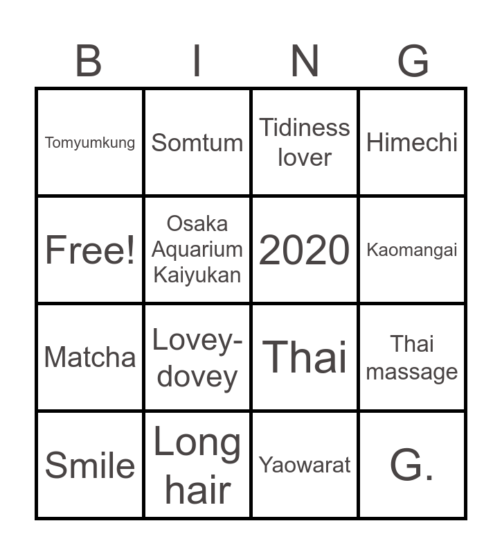 This bingo card has 44 words: Online dating, Osaka Aquarium Kaiyukan, House, Punnawitee, Sushi, Thai tea, Tidiness lover, Tall, Free!, Shun, 2020, G., Smile, Asokaram Temple, Osaka, Udon, Ratchada Night Market, Somtum, Fire app, Thai massage, Tomyumkung, Vietnam, Short, Himechi, Thammasat University, Lovey-dovey, Dee-Naa!, 1991, 1993, Long hair, Nan-Lae!, Bangna, SoNaYa, Icon Siam, Siam, Songkran festival, Shopping Mall, Teppanyaki, Yaowarat, Kaomangai, Matcha, Ramen, Thai and Nihongo.