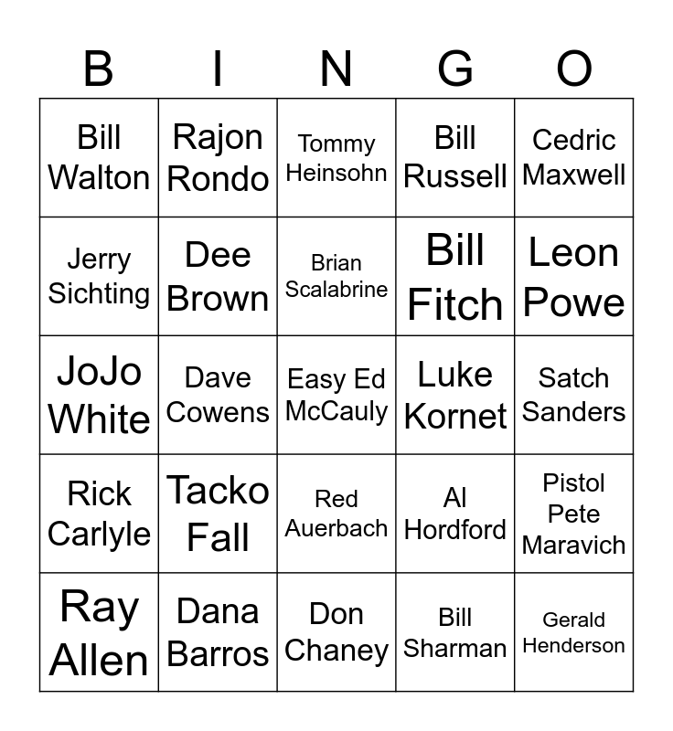 This bingo card has 69 words: Larry Bird, Satch Sanders, Jayson Tatem, Derrick White, Dana Barros, Kevin McHale, Bill Russell, Danny Ainge, Cedric Maxwell, Payton Pritchard, Pistol Pete Maravich, John Havlicek, Bill Walton, Tommy Heinsohn, Bob Cousy, Dave Cowens, Red Auerbach, Bill Fitch, Chris Ford, Rick Carlyle, Luke Kornet, Al Hordford, Leon Powe, Paul Pierce, Antoine Walker, Kenny Anderson, Lucky, Johnny Most, Bill Sharman, Jim Luscutoff, Rajon Rondo, Vitaly Potpenko, Rick Robey, Hank Finkel, Sam Jones, KC Jones, Brad Stevens, Jim O'Brien, Jerry Sichting, Gerald Henderson, Tacko Fall, Easy Ed McCauly, Glen "Big Baby" Davis, Kendrick Perkins, Kevin Garnett, Ray Allen, Paul Silas, Eddie House, Don Nelson, Dee Brown, Brian Scalabrine, Adrian Griffin, Dennis Johnson, Don Chaney, Eric Williams, James Posey, Chuck Connors, Jaylen Brown, Frank Ramsey, JoJo White, Jrue Holiday, Kristaps Porzingas, Jordan Walsh, ML Carr, Scott Wedman, Sam Hauser, Rodney Rogers, Steve Kuberski and Reggie Lewis.