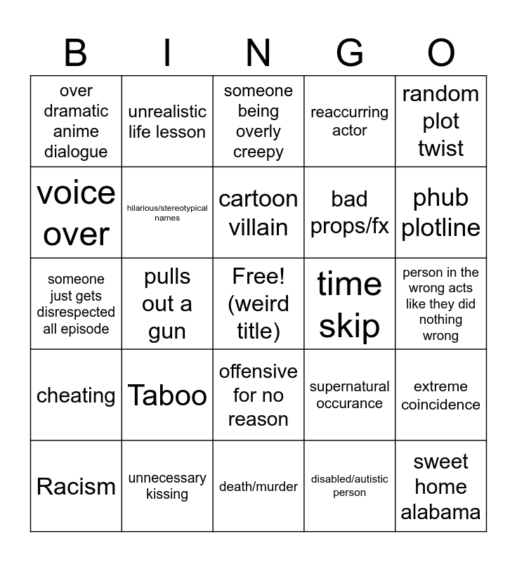 This bingo card has a free space and 24 words: Taboo, unnecessary kissing, cartoon villain, Racism, random plot twist, over dramatic anime dialogue, voice over, unrealistic life lesson, time skip, offensive for no reason, bad props/fx, someone just gets disrespected all episode, supernatural occurance, extreme coincidence, hilarious/stereotypical names, disabled/autistic person, person in the wrong acts like they did nothing wrong, someone being overly creepy, phub plotline, pulls out a gun, sweet home alabama, cheating, reaccurring actor and death/murder.