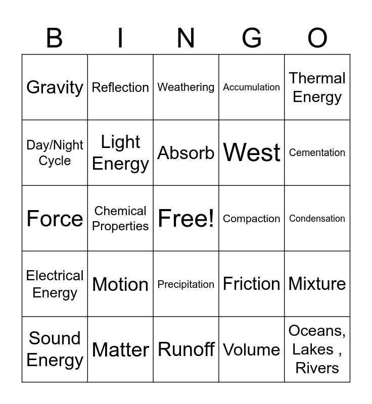 This bingo card has a free space and 34 words: Mass, Volume, Density, Mechanical Energy, Electrical Energy, Light Energy, Thermal Energy, Sound Energy, Reflection, Refraction, Absorb, Weathering, Erosion, Deposition, Compaction, Cementation, Matter, Force, Motion, Friction, Precipitation, Evaporation, Gravity, Condensation, Runoff, Oceans, Lakes , Rivers, Accumulation, East, West, Day/Night Cycle, Physical Properties, Chemical Properties, Mixture and Solution.