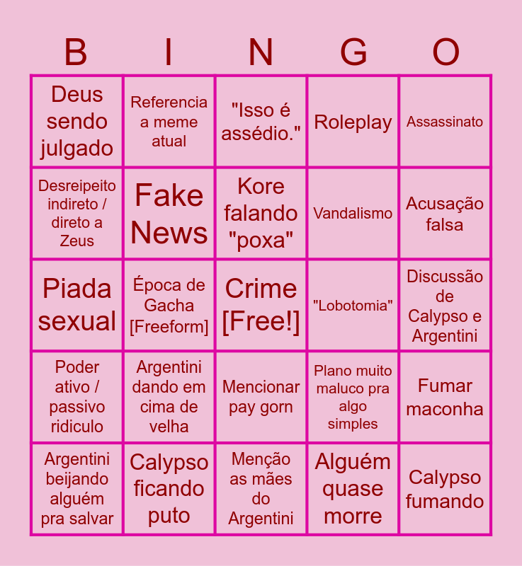This bingo card has a free space and 24 words: Argentini dando em cima de velha, Calypso ficando puto, Kore falando "poxa", Argentini beijando alguém pra salvar, Assassinato, Deus sendo julgado, Desreipeito indireto / direto a Zeus, Referencia a meme atual, "Lobotomia", Mencionar pay gorn, Vandalismo, Piada sexual, Plano muito maluco pra algo simples, Fumar maconha, Fake News, Alguém quase morre, Discussão de Calypso e Argentini, "Isso é assédio.", Acusação falsa, Época de Gacha [Freeform], Calypso fumando, Poder ativo / passivo ridiculo, Roleplay and Menção as mães do Argentini.