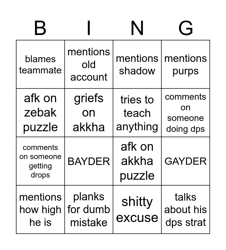 This bingo card has 16 words: planks for dumb mistake, GAYDER, mentions shadow, blames teammate, comments on someone getting drops, mentions old account, afk on akkha puzzle, shitty excuse, afk on zebak puzzle, griefs on akkha, mentions how high he is, mentions purps, BAYDER, comments on someone doing dps, tries to teach anything and talks about his dps strat.