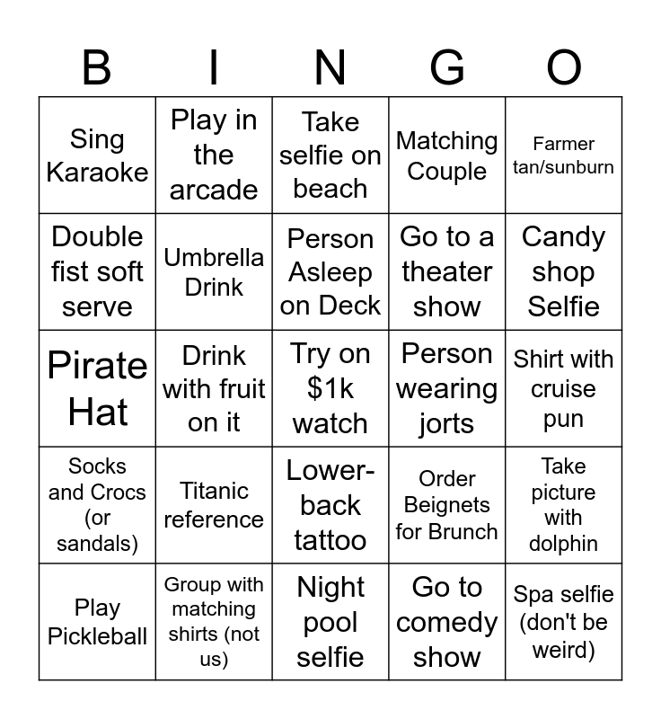 This bingo card has 41 words: Hawaiian Shirt, Pirate Hat, Coconut cup, Umbrella Drink, Group with matching shirts (not us), Lower-back tattoo, Person Asleep on Deck, Ship Captain, Farmer tan/sunburn, Socks and Crocs (or sandals), Drink with fruit on it, Matching Couple, Try on $1k watch, Shirt with cruise pun, Person wearing jorts, Titanic reference, Go down slide, Sing Karaoke, Eat two desserts, Take selfie on beach, Take picture with dolphin, Spa selfie (don't be weird), Night pool selfie, Go to a theater show, Watch movie on deck, Pic with Thing 1 & 2, Go to comedy show, Play real Bingo, Candy shop Selfie, Play mini-golf, Visit the art exhibit, Play in the arcade, Play Pickleball, Eat a Super Melty Mootz, Order Beignets for Brunch, Double fist soft serve, Build a burrito, Solo-eat a pizza, Eat meatball sub from The Deli, Eat a steak and Port-selfie with ship.