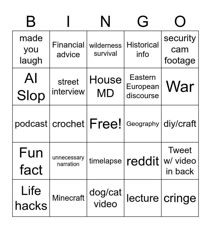 This bingo card has a free space and 24 words: unnecessary narration, Minecraft, House MD, Life hacks, security cam footage, made you laugh, AI Slop, Financial advice, Geography, timelapse, Eastern European discourse, podcast, reddit, Tweet w/ video in back, street interview, lecture, diy/craft, wilderness survival, War, crochet, cringe, Fun fact, Historical info and dog/cat video.
