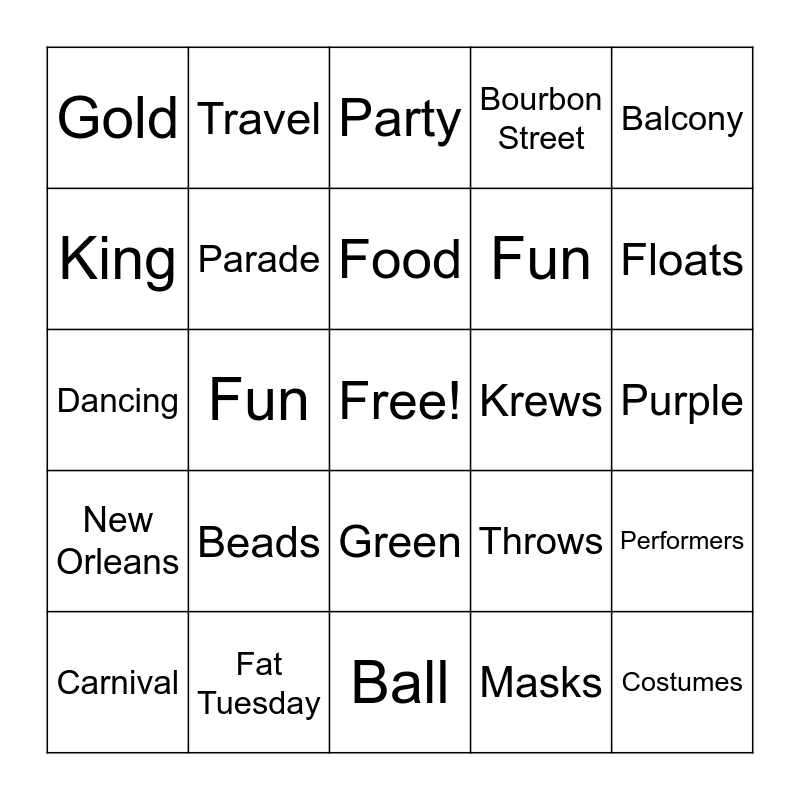 This bingo card has a free space and 29 words: Carnival, Spirits, Fun, King Cake, Gold, Party, Parade, Beads, Krews, Fat Tuesday, Purple, Costumes, Ball, Masks, Floats, Music, Green, New Orleans, Balcony, Dancing, Throws, Queen, Fun, King, Bourbon Street, Travel, Performers, Food and Celebrate.