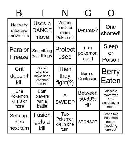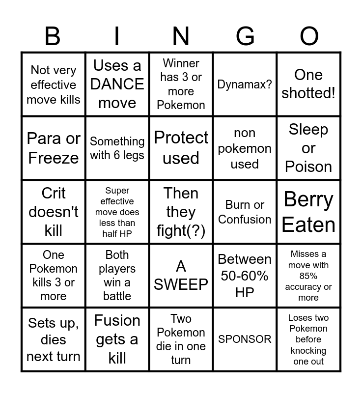 This bingo card has a free space and 24 words: Both players win a battle, Fusion gets a kill, Protect used, Sets up, dies next turn, One shotted!, Not very effective move kills, Para or Freeze, Uses a DANCE move, Burn or Confusion, A SWEEP, non pokemon used, Crit doesn't kill, Between 50-60% HP, Misses a move with 85% accuracy or more, Something with 6 legs, SPONSOR, Berry Eaten, Winner has 3 or more Pokemon, Sleep or Poison, Super effective move does less than half HP, Loses two Pokemon before knocking one out, One Pokemon kills 3 or more, Dynamax? and Two Pokemon die in one turn.