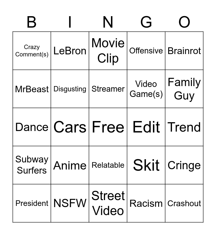 This bingo card has a free space and 24 words: Anime, NSFW, Streamer, President, Brainrot, Crazy Comment(s), MrBeast, LeBron, Edit, Relatable, Video Game(s), Dance, Skit, Cringe, Disgusting, Racism, Trend, Movie Clip, Family Guy, Cars, Crashout, Subway Surfers, Offensive and Street Video.