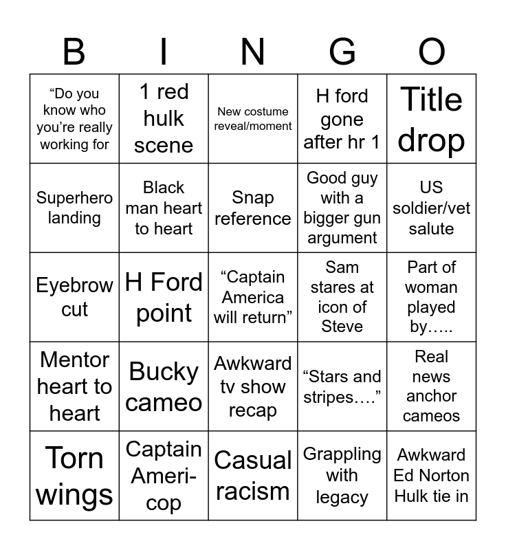 This bingo card has a free space and 29 words: Torn wings, “Well that just happened/are you seeing this” line, H Ford point, Third act politcial commentary, “Do you know who you’re really working for, New costume reveal/moment, Black man heart to heart, Bucky cameo, Sam stares at icon of Steve, Captain Ameri-cop, Part of woman played by….., Awkward Ed Norton Hulk tie in, Casual racism, Grappling with legacy, US soldier/vet salute, Uncomfortable Chadwick boseman shout out, Awkward tv show recap, Mentor heart to heart, Title drop, Eyebrow cut, “Stars and stripes….”, “I’ve never seen anything like this”, Good guy with a bigger gun argument, Superhero landing, H ford gone after hr 1, 1 red hulk scene, Real news anchor cameos, Snap reference and Lampshading no green hulk.