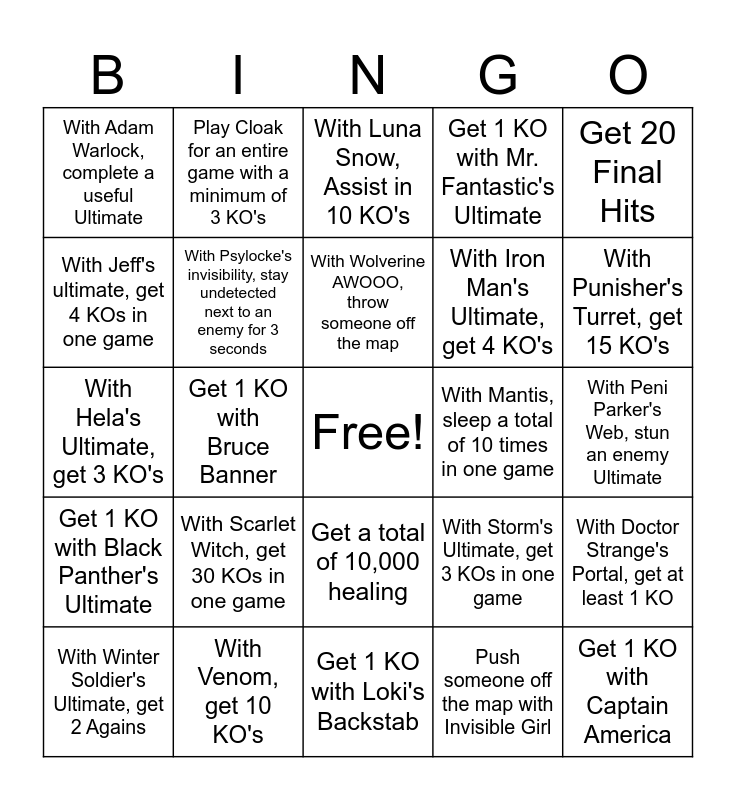 This bingo card has a free space and 24 words: With Scarlet Witch, get 30 KOs in one game, With Venom, get 10 KO's, With Wolverine AWOOO, throw someone off the map, With Winter Soldier's Ultimate, get 2 Agains, Get 20 Final Hits, With Adam Warlock, complete a useful Ultimate, With Jeff's ultimate, get 4 KOs in one game, Play Cloak for an entire game with a minimum of 3 KO's, With Mantis, sleep a total of 10 times in one game, Get a total of 10,000 healing, With Iron Man's Ultimate, get 4 KO's, With Hela's Ultimate, get 3 KO's, With Storm's Ultimate, get 3 KOs in one game, With Doctor Strange's Portal, get at least 1 KO, With Psylocke's invisibility, stay undetected next to an enemy for 3 seconds, Push someone off the map with Invisible Girl, With Peni Parker's Web, stun an enemy Ultimate, With Luna Snow, Assist in 10 KO's, With Punisher's Turret, get 15 KO's, Get 1 KO with Bruce Banner, Get 1 KO with Captain America, Get 1 KO with Black Panther's Ultimate, Get 1 KO with Mr. Fantastic's Ultimate and Get 1 KO with Loki's Backstab.