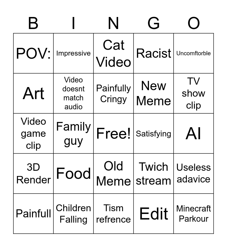 This bingo card has a free space and 24 words: Food, Children Falling, Painfully Cringy, Painfull, Uncomftorble, POV:, Art, Impressive, Satisfying, Old Meme, New Meme, Video game clip, Twich stream, Useless adavice, Video doesnt match audio, Edit, AI, Cat Video, TV show clip, Family guy, Minecraft Parkour, 3D Render, Racist and Tism refrence.
