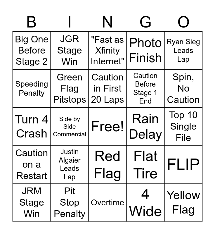 This bingo card has a free space and 24 words: Justin Algaier Leads Lap, Pit Stop Penalty, Caution in First 20 Laps, JRM Stage Win, Ryan Sieg Leads Lap, Big One Before Stage 2, Speeding Penalty, JGR Stage Win, Rain Delay, Red Flag, Caution Before Stage 1 End, Turn 4 Crash, Flat Tire, FLIP, Green Flag Pitstops, 4 Wide, Top 10 Single File, "Fast as Xfinity Internet", Spin, No Caution, Side by Side Commercial, Yellow Flag, Caution on a Restart, Photo Finish and Overtime.
