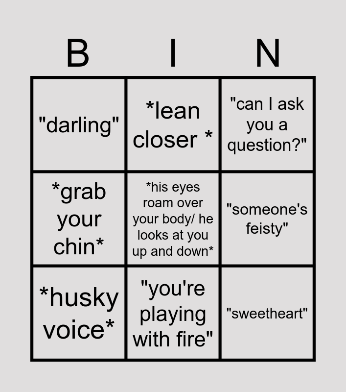 This bingo card has a free space and 8 words: "someone's feisty", "can I ask you a question?", *lean closer *, *husky voice*, "darling", "sweetheart", *grab your chin* and "you're playing with fire".