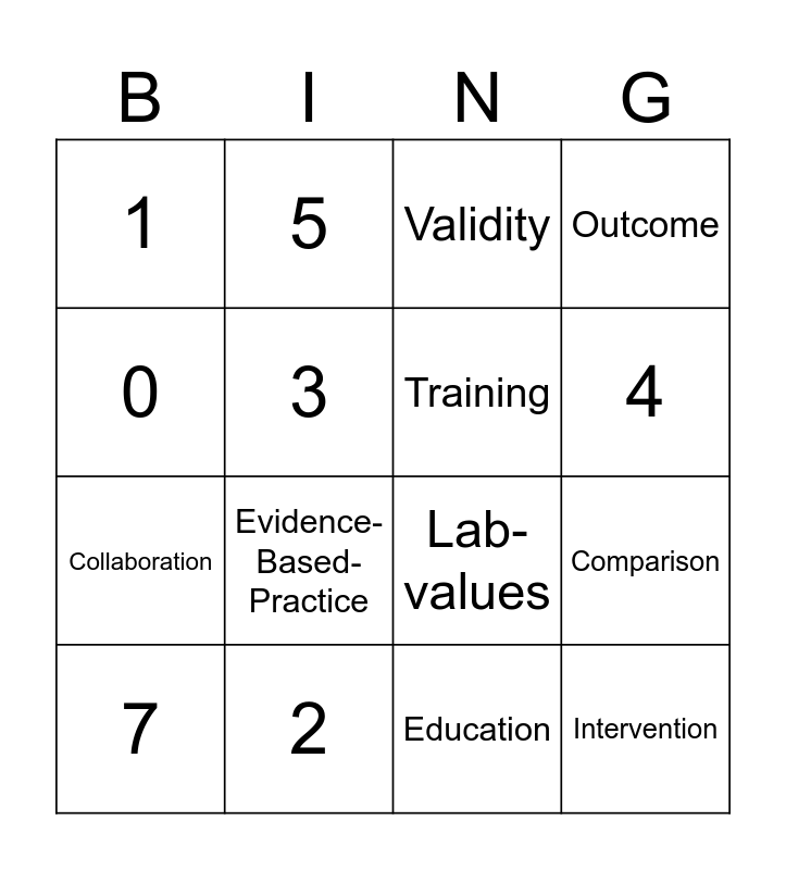 This bingo card has 1 images and 24 words: Free Space, 4, 6, 0, 1, 3, 5, 2, PICOT, Collaboration, Lab-values, Assessments, Presentations, Training, Culture, Education, Validity, Evidence-Based-Practice, Comparison, 7, Population, Intervention, Outcome and Time.