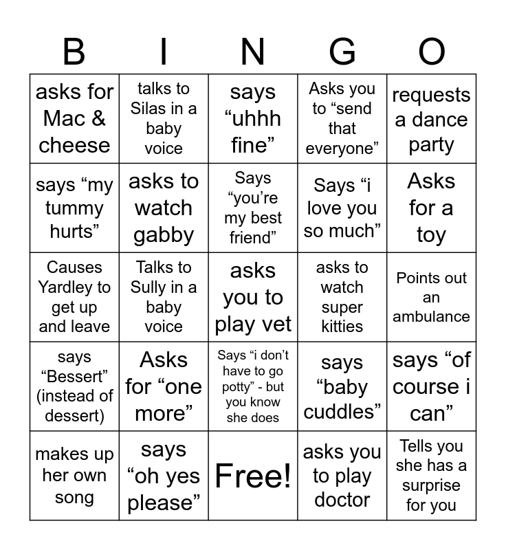 This bingo card has 25 words: says “Bessert” (instead of dessert), says “oh yes please”, asks you to play vet, asks you to play doctor, requests a dance party, asks for Mac & cheese, talks to Silas in a baby voice, says “uhhh fine”, asks to watch super kitties, says “of course i can”, says “my tummy hurts”, asks to watch gabby, Free!, says “baby cuddles”, Asks for a toy, makes up her own song, Talks to Sully in a baby voice, Says “you’re my best friend”, Says “i love you so much”, Points out an ambulance, Causes Yardley to get up and leave, Asks for “one more”, Says “i don’t have to go potty” - but you know she does, Asks you to “send that everyone” and Tells you she has a surprise for you.