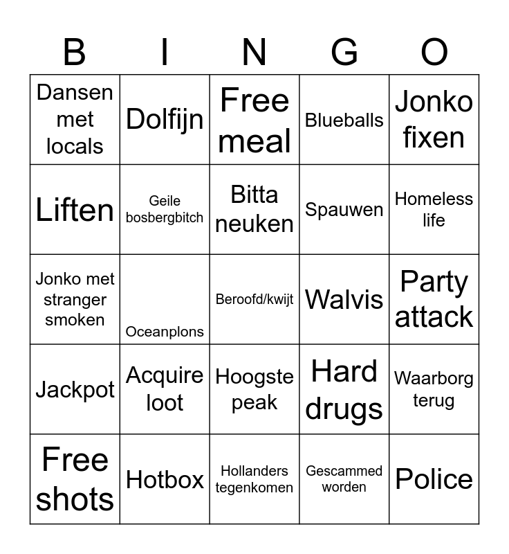 This bingo card has 25 words: Acquire loot, Hollanders tegenkomen, Bitta neuken, Free shots, Jonko fixen, Dansen met locals, Liften, Dolfijn, Walvis, Hoogste peak, Spauwen, Jonko met stranger smoken, Hard drugs, Waarborg terug, Geile bosbergbitch, Police, Party attack, Free meal, Homeless life, Oceanplons, Beroofd/kwijt, Hotbox, Jackpot, Blueballs and Gescammed worden.
