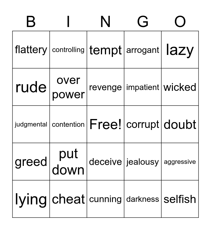 This bingo card has a free space and 29 words: lying, anger, contention, destroy, flattery, tempt, over power, put down, corrupt, cheat, doubt, selfish, cunning, darkness, wicked, stir up, deceive, greed, lazy, judgmental, jealousy, manipulative, impatient, rude, arrogant, controlling, aggressive, revenge and bossy.