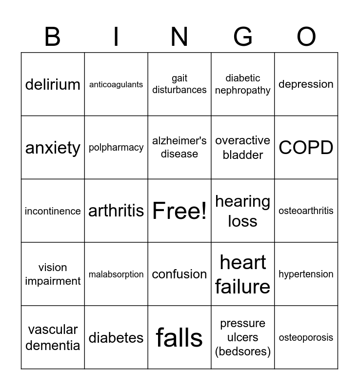 This bingo card has a free space and 24 words: malabsorption, diabetes, alzheimer's disease, vascular dementia, depression, delirium, anxiety, anticoagulants, hearing loss, confusion, overactive bladder, incontinence, heart failure, hypertension, polpharmacy, pressure ulcers (bedsores), osteoarthritis, gait disturbances, COPD, arthritis, osteoporosis, vision impairment, diabetic nephropathy and falls.