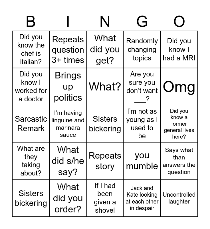 This bingo card has a free space and 24 words: What did s/he say?, What did you order?, What?, Sisters bickering, Did you know I had a MRI, Did you know the chef is italian?, Did you know I worked for a doctor, Repeats question 3+ times, I’m not as young as I used to be, Repeats story, Are you sure you don’t want ___?, Sarcastic Remark, you mumble, Says what than answers the question, Brings up politics, Jack and Kate looking at each other in despair, Did you know a former general lives here?, What did you get?, Omg, I’m having linguine and marinara sauce, Uncontrolled laughter, What are they taking about?, Randomly changing topics and If I had been given a shovel.