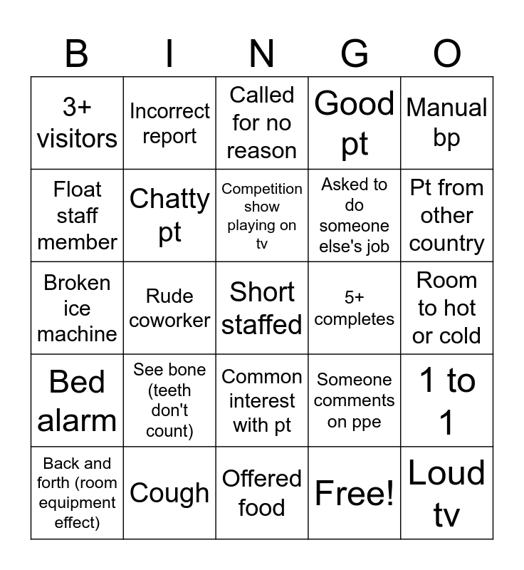 This bingo card has 30 words: Cough, Rude pt, Rude coworker, Hit call bell, 3+ visitors, Called for no reason, Chatty pt, Common interest with pt, 5+ completes, Offered food, Room to hot or cold, Short staffed, Free!, Loud tv, Pt from other country, 6+ tele, Someone comments on ppe, Bed alarm, See bone (teeth don't count), Manual bp, Broken ice machine, Random pull, Incorrect report, Asked to do someone else's job, Float staff member, Good pt, 1 to 1, Back and forth (room equipment effect), Competition show playing on tv and Going into a PT's room 4+ times.