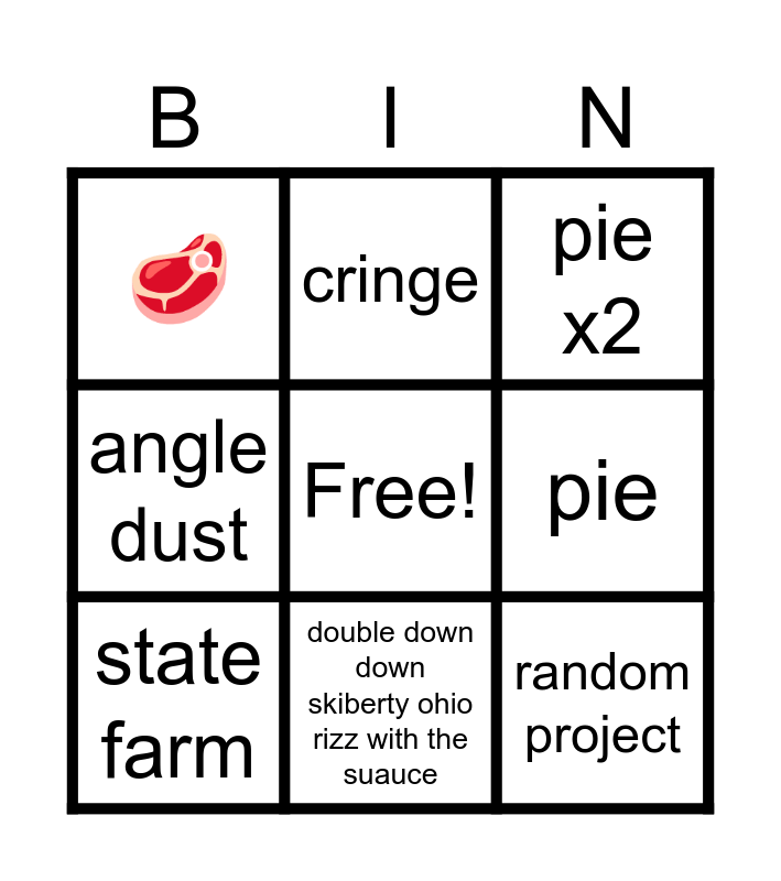This bingo card has a free space and 8 words: pie, pie x2, cringe, state farm, 🥩, random project, angle dust and double down down skiberty ohio rizz with the suauce.