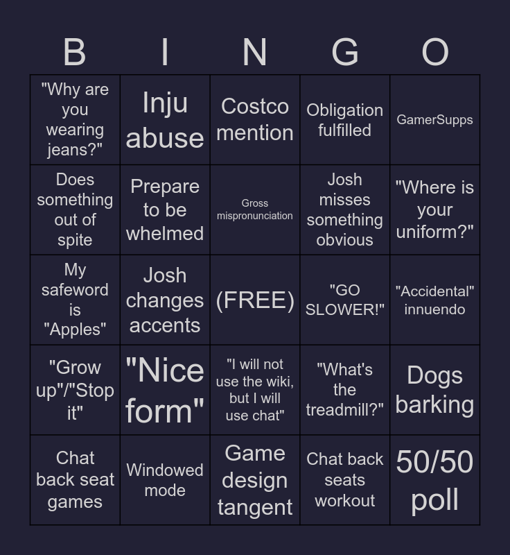 This bingo card has a free space and 38 words: Visa abuse, SACK, Josh gets utterly lost, Prepare to be whelmed, Dogs barking, "Nice form", Gross mispronunciation, Wearing shoes indoors, GamerSupps, Josh misses something obvious, Josh changes accents, Obligation fulfilled, 50/50 poll, "Accidental" innuendo, Does something out of spite, "Grow up"/"Stop it", Josh discovers a cheese strat, Costco mention, "Not sponsored, but I should be", "GO SLOWER!", "Why are you wearing jeans?", Windowed mode, "Where is your uniform?", Chat back seat games, "Nice" 69, Game design tangent, Morality tangent, Real life advice, Henry Cavill, "Don't clip this", Stolen joke from chat, "I will not use the wiki, but I will use chat", Chat back seats workout, Inju abuse, DVD logo hits the corner, "What's the treadmill?", My safeword is "Apples" and Wheel is cruel.
