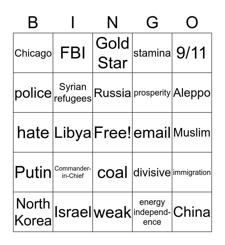 This bingo card has a free space and 24 words: Commander-in-Chief, Israel, Russia, North Korea, 9/11, Chicago, police, FBI, email, coal, prosperity, hate, divisive, immigration, Syrian refugees, energy independ- ence, Muslim, Gold Star, Aleppo, Libya, China, Putin, stamina and weak.